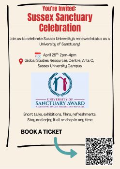 Sussex is very pleased to have been re-accredited as a University of Sanctuary to support refugees and people in the process of asylum. We will be celebrating the reaccreditation on April 29th from 2-4 pm in the Global Studies Resources Centre in Arts C.